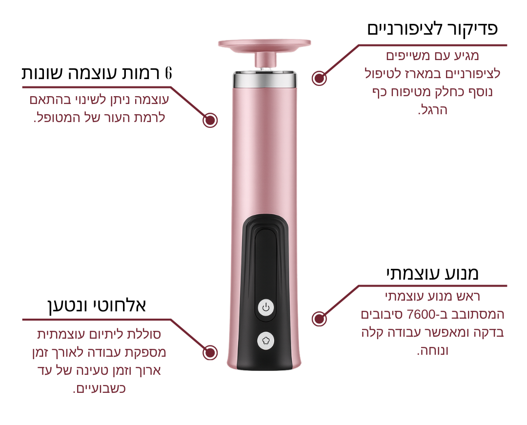 4.מתחילים בעוצמה החלשה ביותר ומעבירים על העור המת בצורה עדינה, ומעלים עוצמה בהדרגה ובהתאם להרגשה.